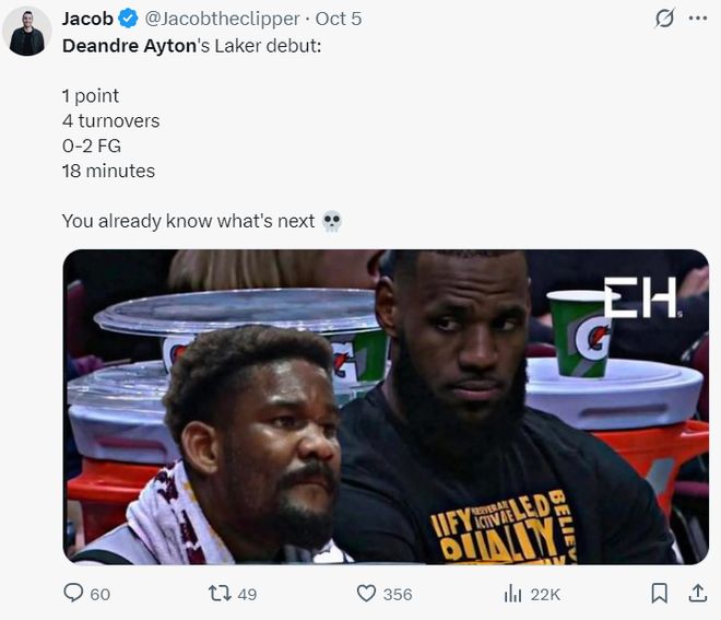 湖人季前赛遭遇二连败,先是不敌太阳随后不敌勇士,没有东契奇、詹姆斯的湖人毫无竞争力可言,休赛期吹了几个月的新援艾顿、拉拉维亚并没有展现出过人的表现,如今湖蜜只能期待斯玛特与蒂耶罗了。