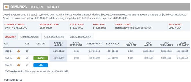 湖人今夏是以两年1620万的合同签下他,这份合同下赛季薪水为810万,26-27赛季是810万,这份合同没有球队选项与球员选项,可全额保障,一开始都觉得湖人低价签下27岁的前状元艾顿赢麻了,可当艾顿登场才知道,他跟联盟顶级的内线差距有多大。