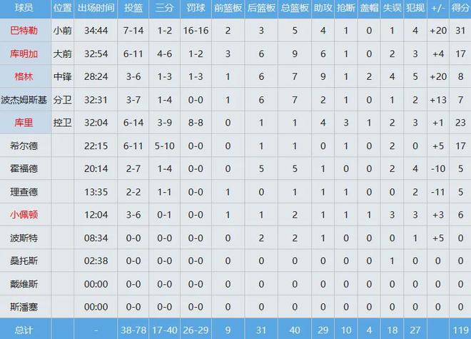 勇士四人得分上双,巴特勒16罚全中轰下31分外加5板4助,库里23分4助,库明加17分9板6助,希尔德17分。