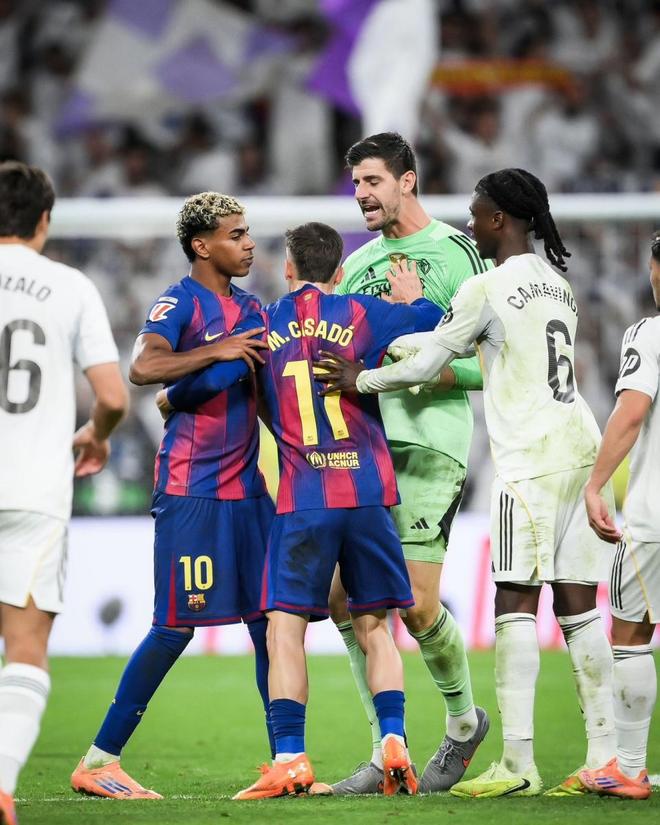 维尼修斯在返回更衣室途中从远处与亚马尔交错,对着他做出“嫌他话太多”的手势,亚马尔直接约维尼修斯去更衣室打架,维尼修斯立刻接受挑战,转身狂奔过来,但被工作人员拦下。