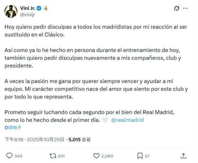 他写道:“今天,我想就我在国家德比中被换下时的反应向所有马德里球迷道歉。正如我今天在训练中亲自所做的那样,我也想再次向我的队友、俱乐部和主席道歉。